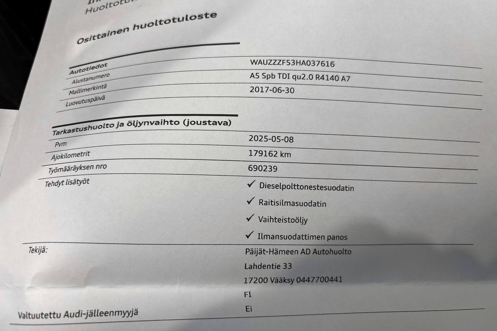 Viimeisin huolto tehty 179 tkm kohdalla 05/2025