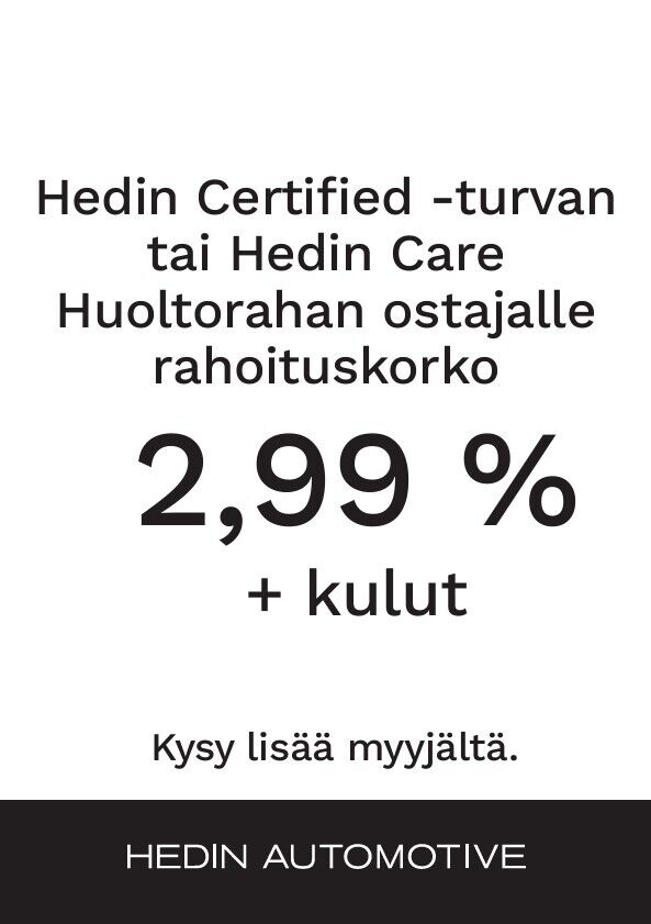 Tähän autoon on saatavilla Hedin Certified -turva 12 kk 790€, 24 kk 1490€ tai 36 kk 1990€. Lue lisää