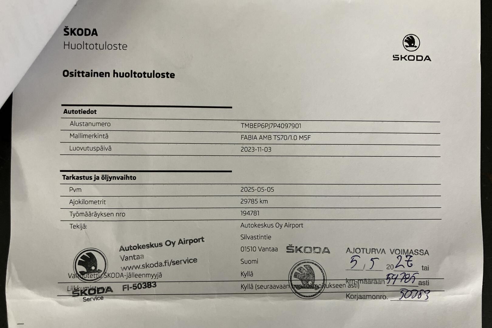 Viimeisin huolto tehty 05/2025
