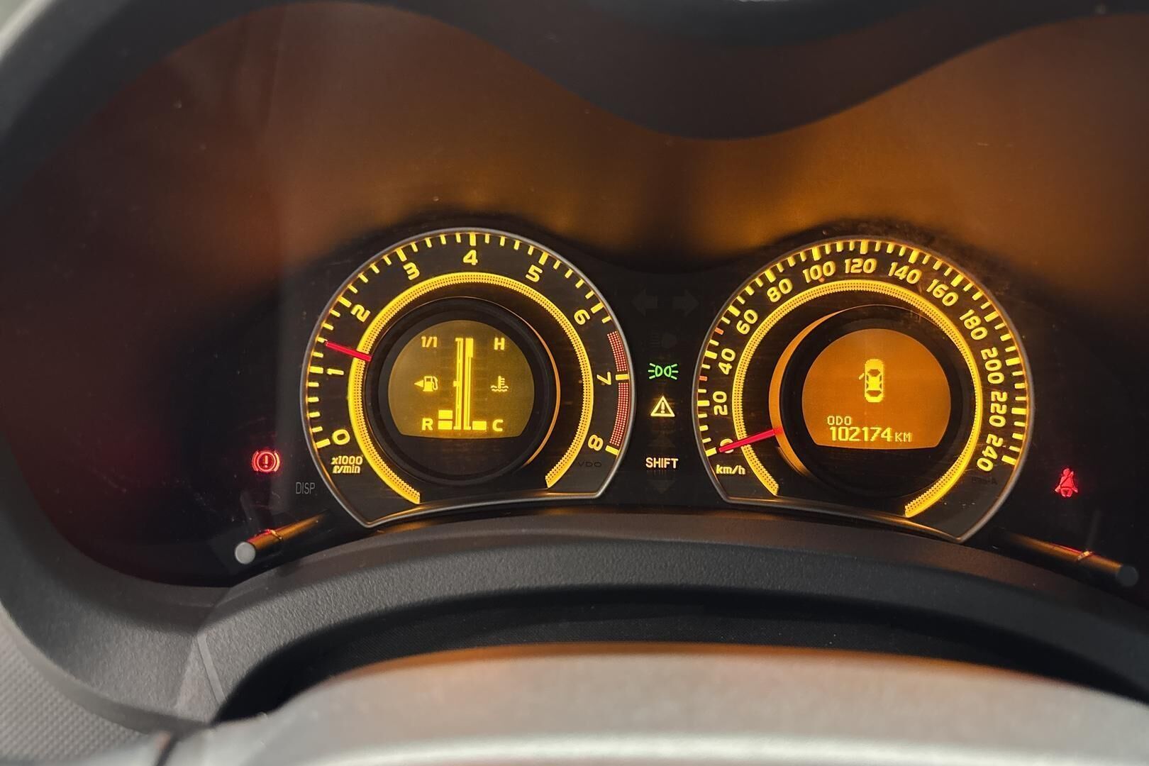 Monitoiminäyttö: kello, ulkolämpötila, päivämäärä, keskinopeus, keskikulutus