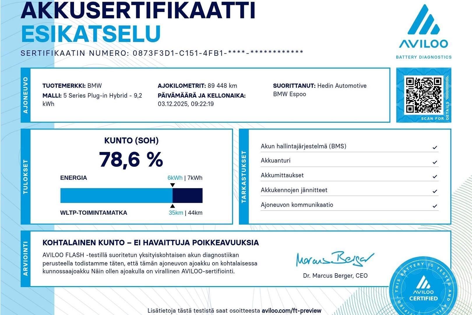 Akun kapasiteetin mittaavan SOH-testin tulos 78,6/100 - lisätietoja saat myyjältä