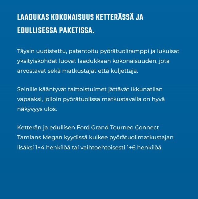 Grand Tourneo Connect Tamlans MEGA - esteetön henkiluljetusvarustelu. Katso lisää: https://www.tamlans.fi/tuote/ford-grand-tourneo-connect/