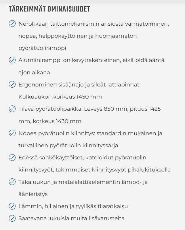 Korimuutostyöpaketti/matalalattia Korimuutostyöpaketti/matalalattia (ei PHEV-mallin eikä AWD-mallin kanssa) - Taka-akselin massankorotuspaketti/muutossarja korimuutostöitä varten (AALA3) - Kolmannen rivin istuinten valmiuspaketti (sisältää turvavyöt kolmannelle riville, mutta poistaa kolmannen rivin istuimet) (BYCBJ) - Ilman vetokoukun esiasennussarjaa (C1QAA) - Ilman hattuhyllyä (AIJAA) - Rengaspaineen ilmaisin (D19AB)