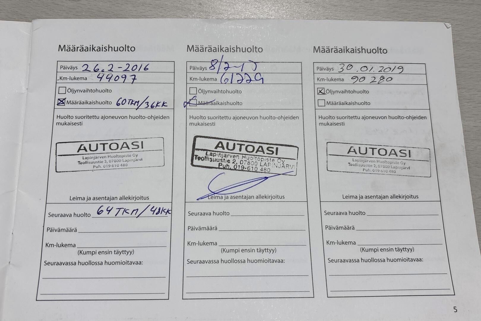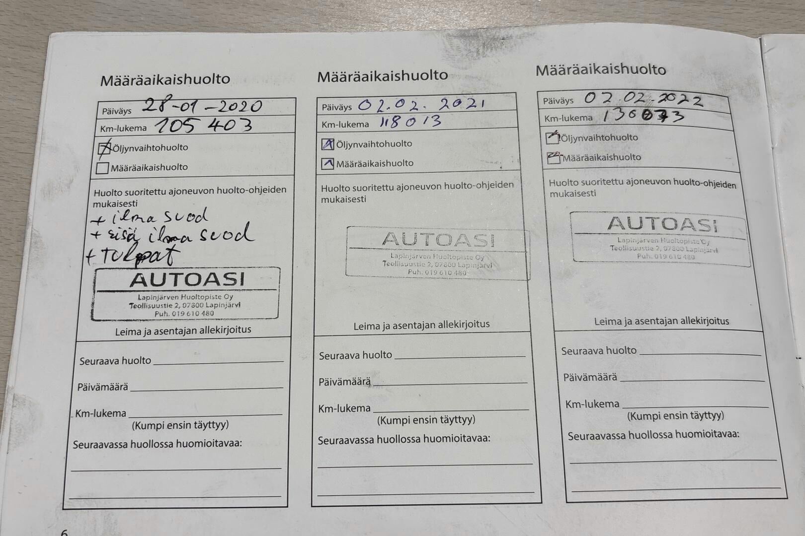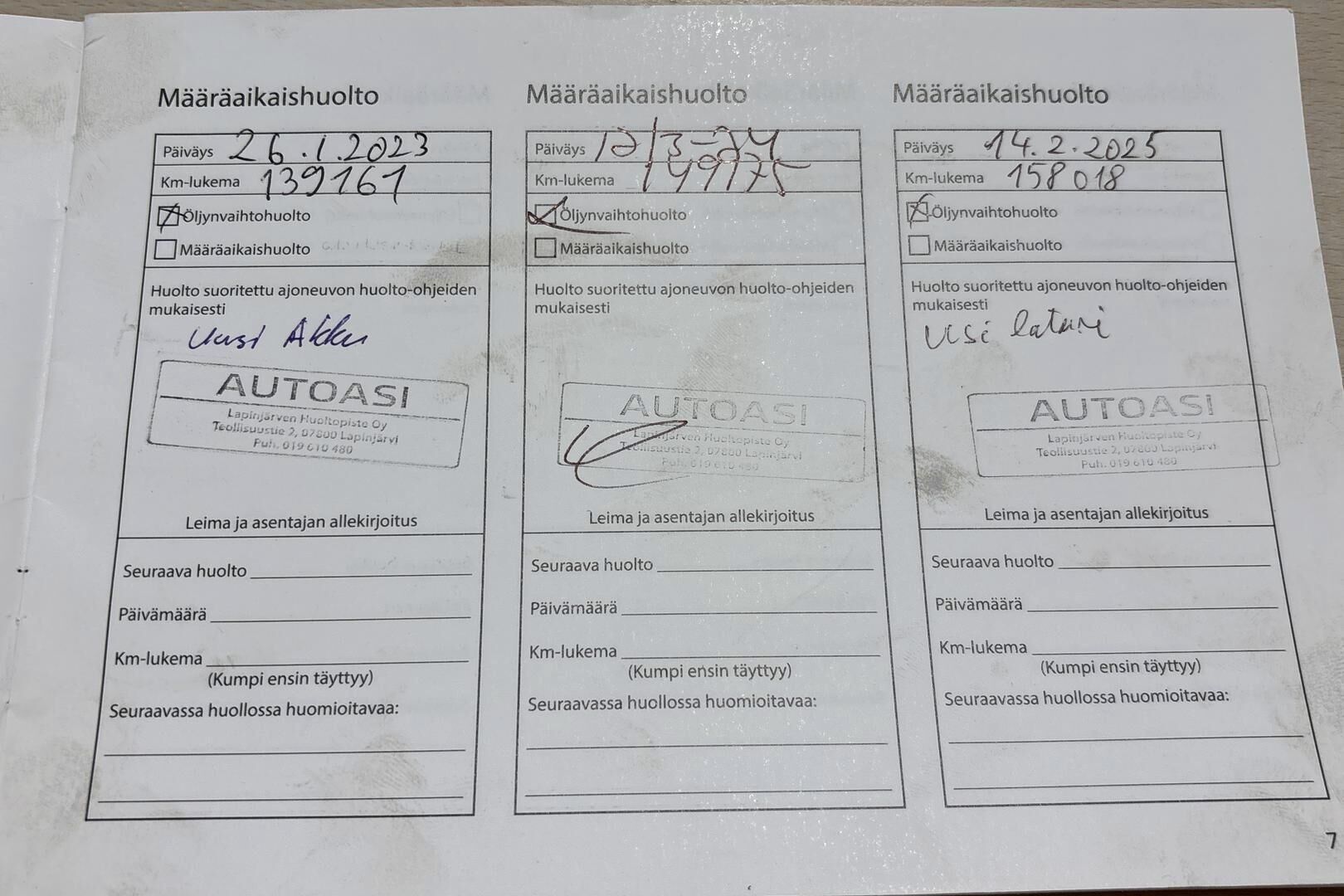 Viimeisin huolto tehty 158 tkm kohdalla 02/2025