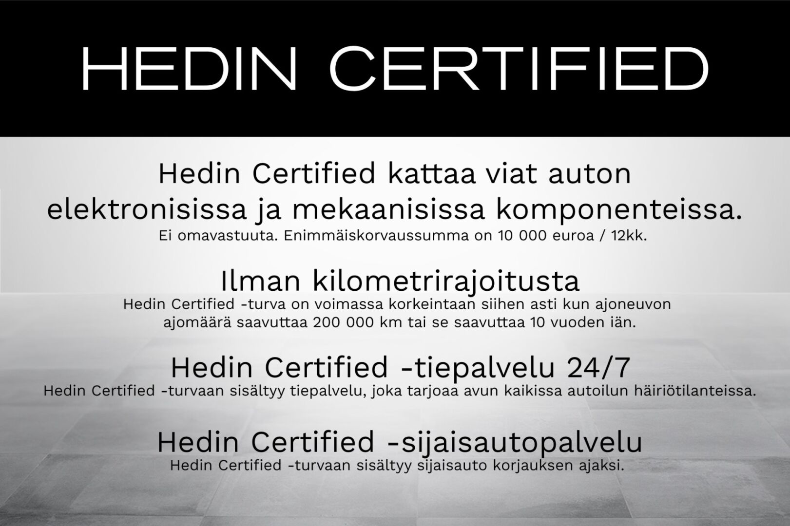 Tähän autoon on saatavilla Hedin Certified -turva 12kk 590€ tai 24 kk 1180€. Lue lisää