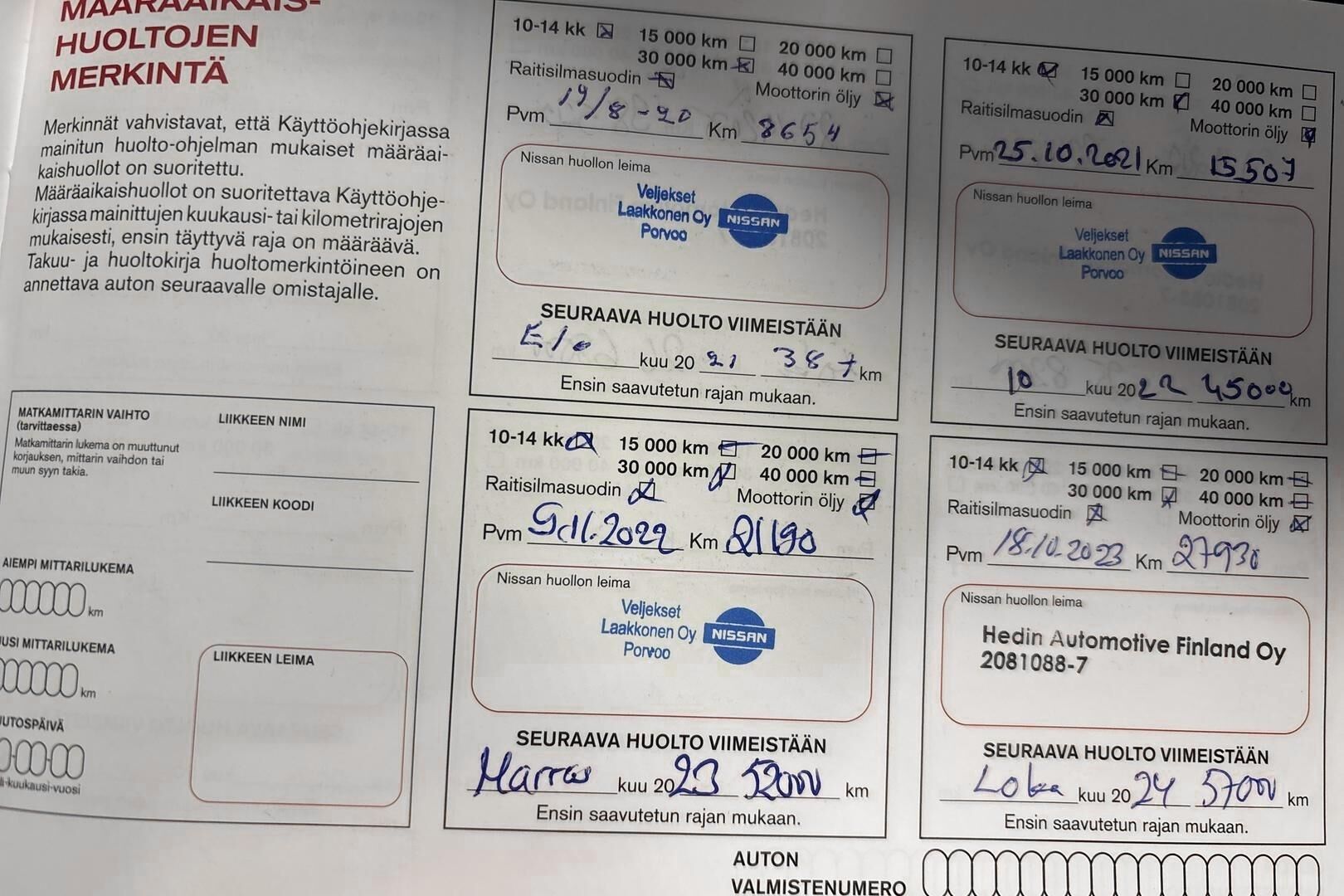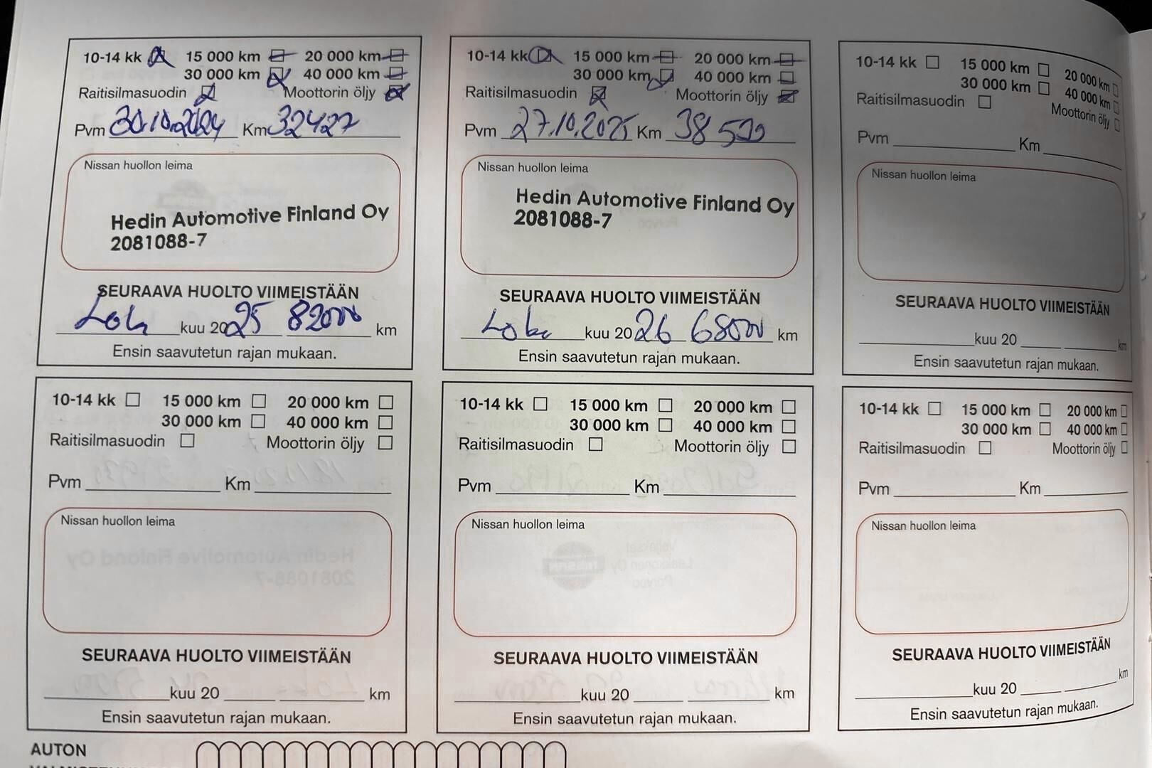Viimeisin huolto tehty 38 tkm kohdalla 10/2025