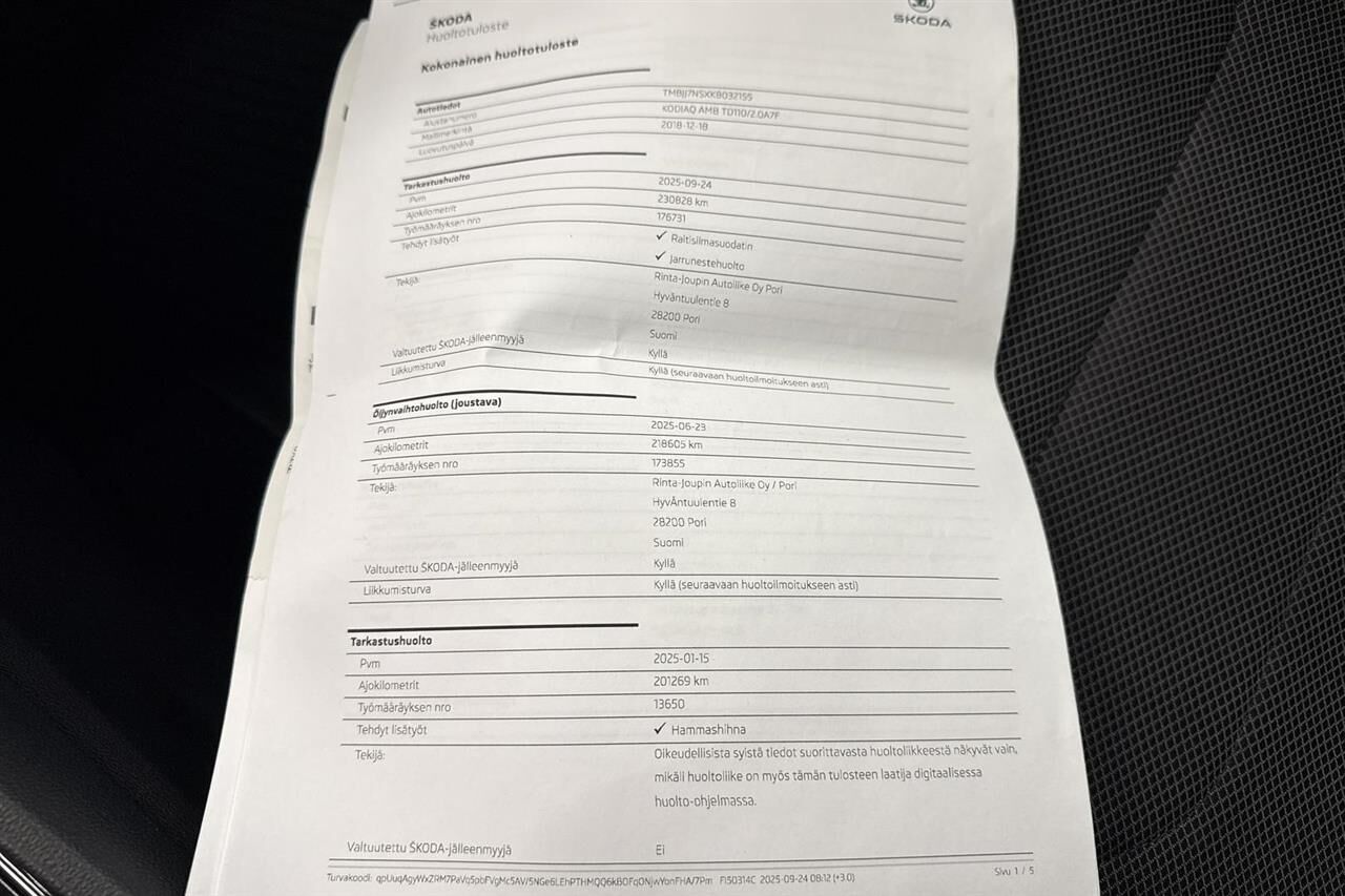 Viimeisin huolto tehty 230 tkm kohdalla 09/2025