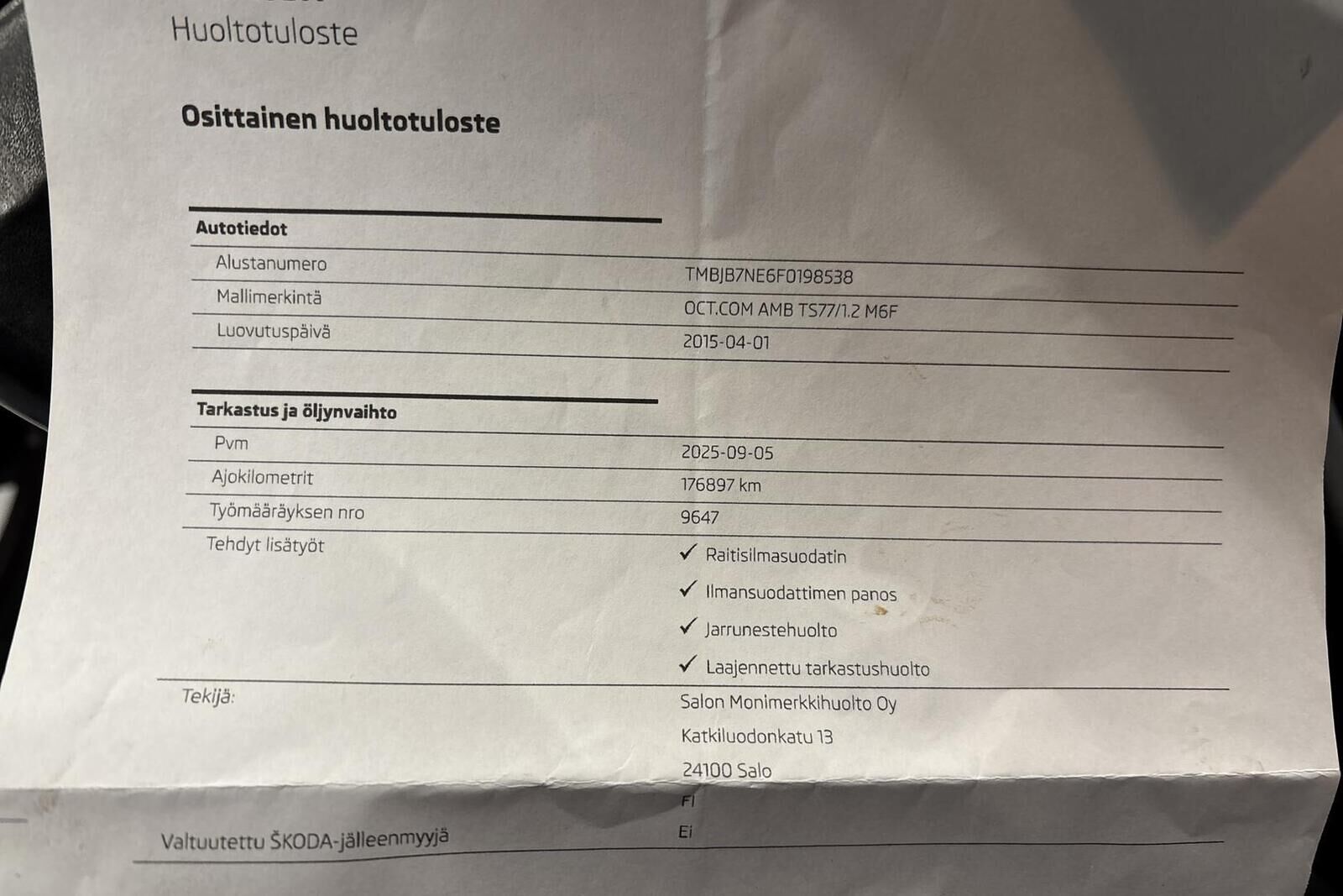Viimeisin huolto tehty 177 tkm kohdalla 09/25