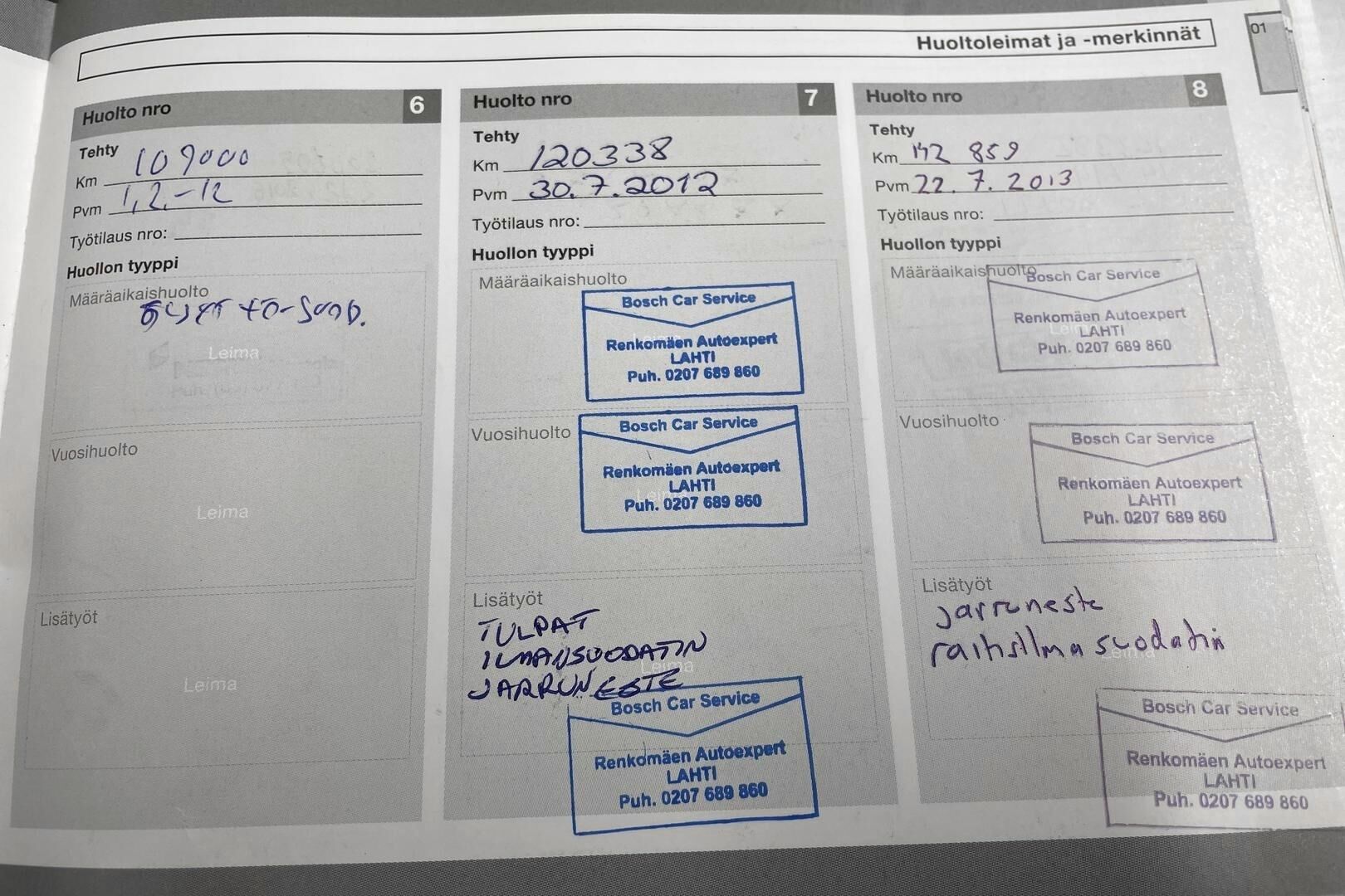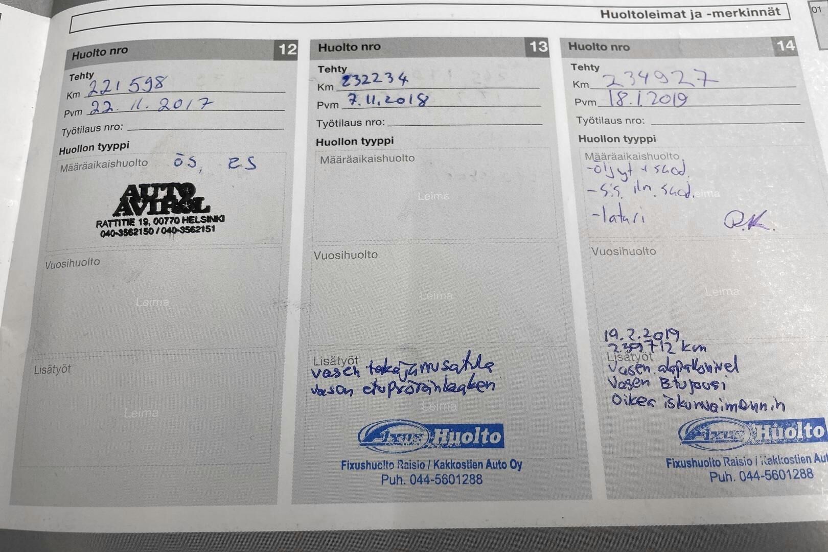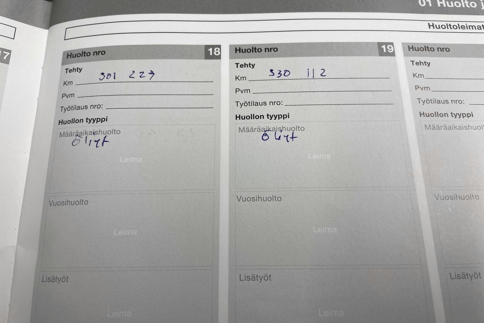 Viimeisin huolto tehty: 330112km