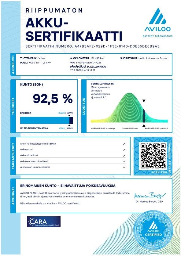 Ajoakusto kuntotarkastettu, tulos 92,5/100 (katso kuva)
