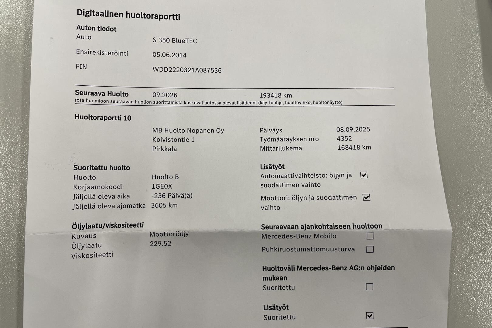 Viimeisin huolto tehty 170 tkm kohdalla 10/2025